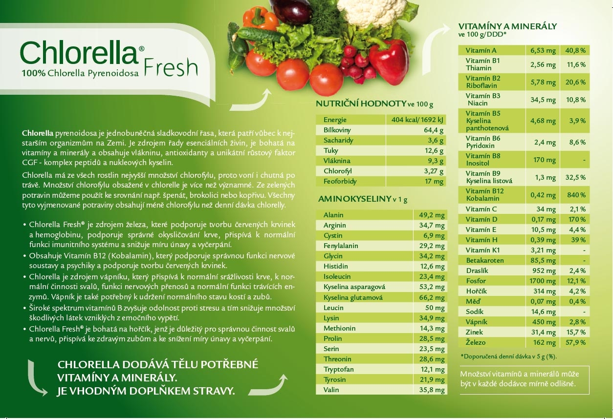 Chlorella Fresh obsahuje významné množství chlorofylu. Ze zelených potravin, které se konzumují právě pro doplnění zeleného barviva, můžeme použít ke srovnání např. špenát, brokolici nebo kopřivu. Všechny tyto vyjmenované potraviny obsahují méně chlorofylu než denní dávka chlorelly.