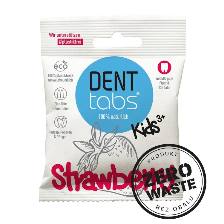 Recyklace a omezení plýtvání pasty = jakmile spotřebujete tablety DENTTABS®, tak je možné obal recyklovat. V tubě zubní pasty průměrně zůstane cca 11 g zbytkové pasty, která je nevyužita a vyhozena do komunálního odpadu. Např. jen v Německu se takto měsíčně vyhodí přes 440 tun zbytkové pasty.