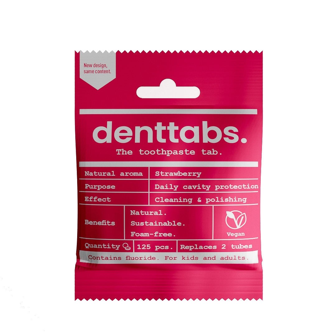 Recyklace a omezení plýtvání pasty = jakmile spotřebujete tablety DENTTABS®, tak je možné obal recyklovat. V tubě zubní pasty průměrně zůstane cca 11 g zbytkové pasty, která je nevyužita a vyhozena do komunálního odpadu. Např. jen v Německu se takto měsíčně vyhodí přes 440 tun zbytkové pasty.