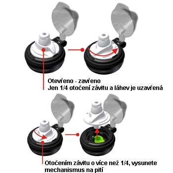 – stačí jen 1/2 otočení nebo 1/4 otočení závitu (dle typu) a láhev je uzavřená.