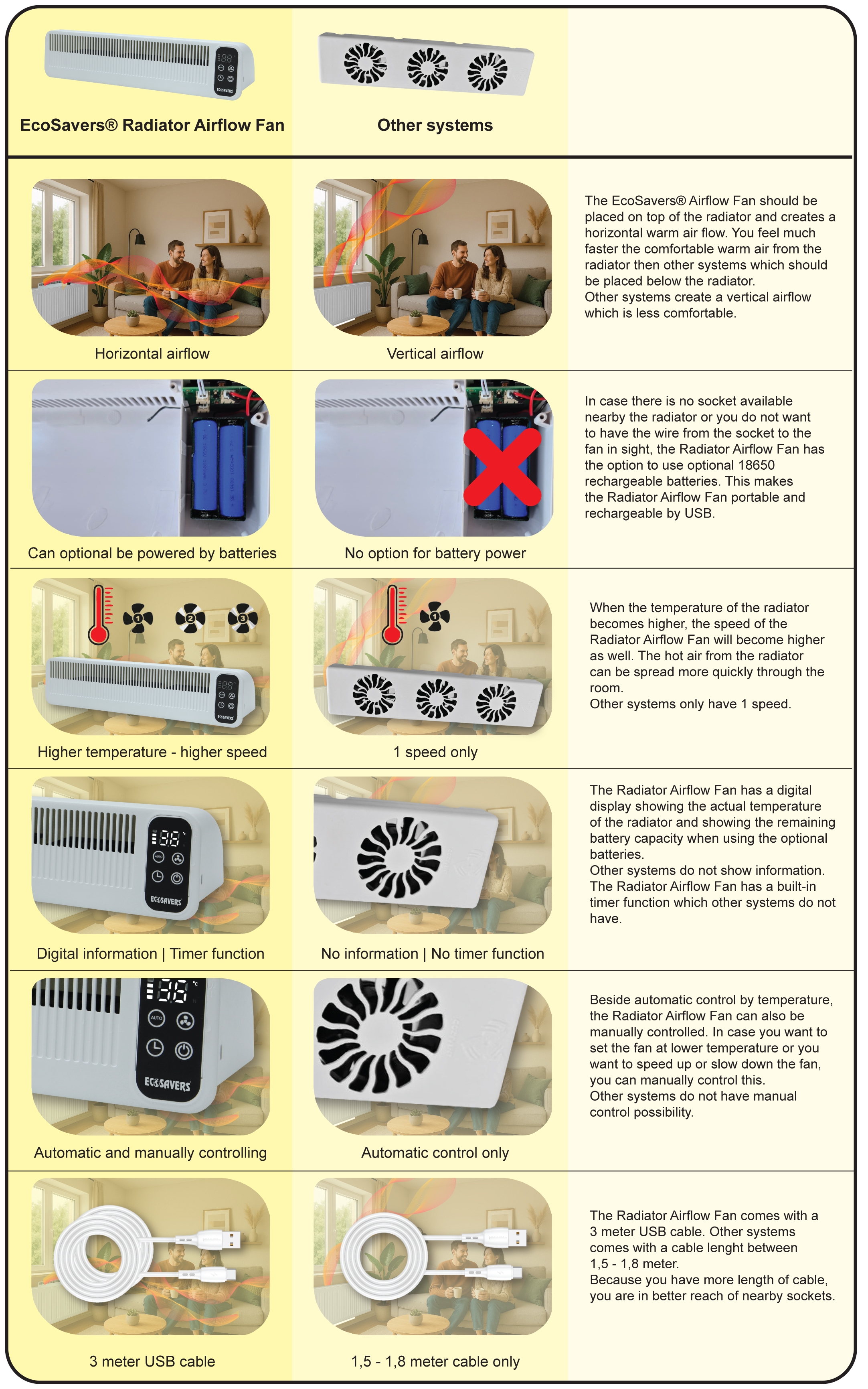 Umístěním Ecosavers Radiator Airflow Fanu na radiátor se vytvoří horizontální proud teplého vzduchu do místnosti.