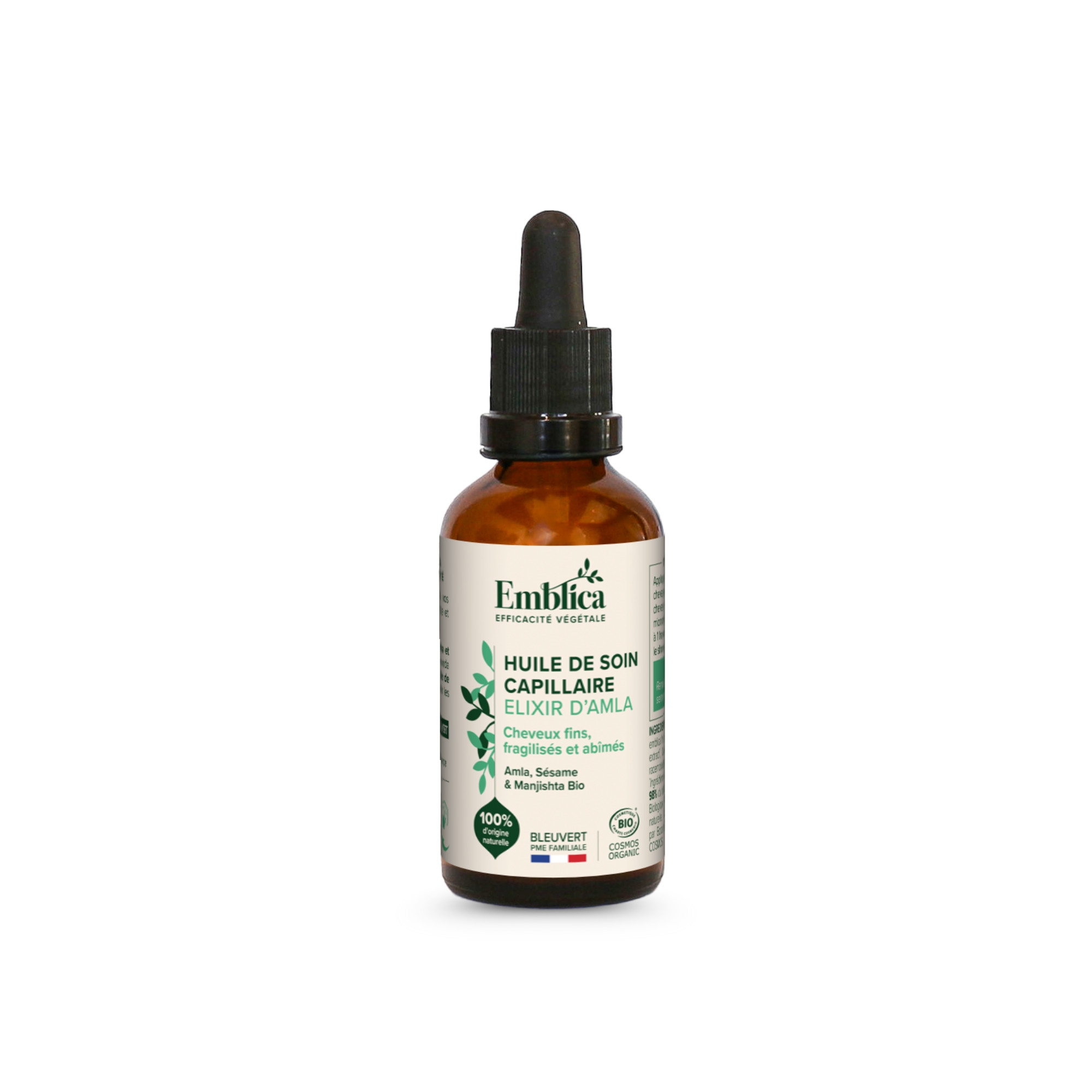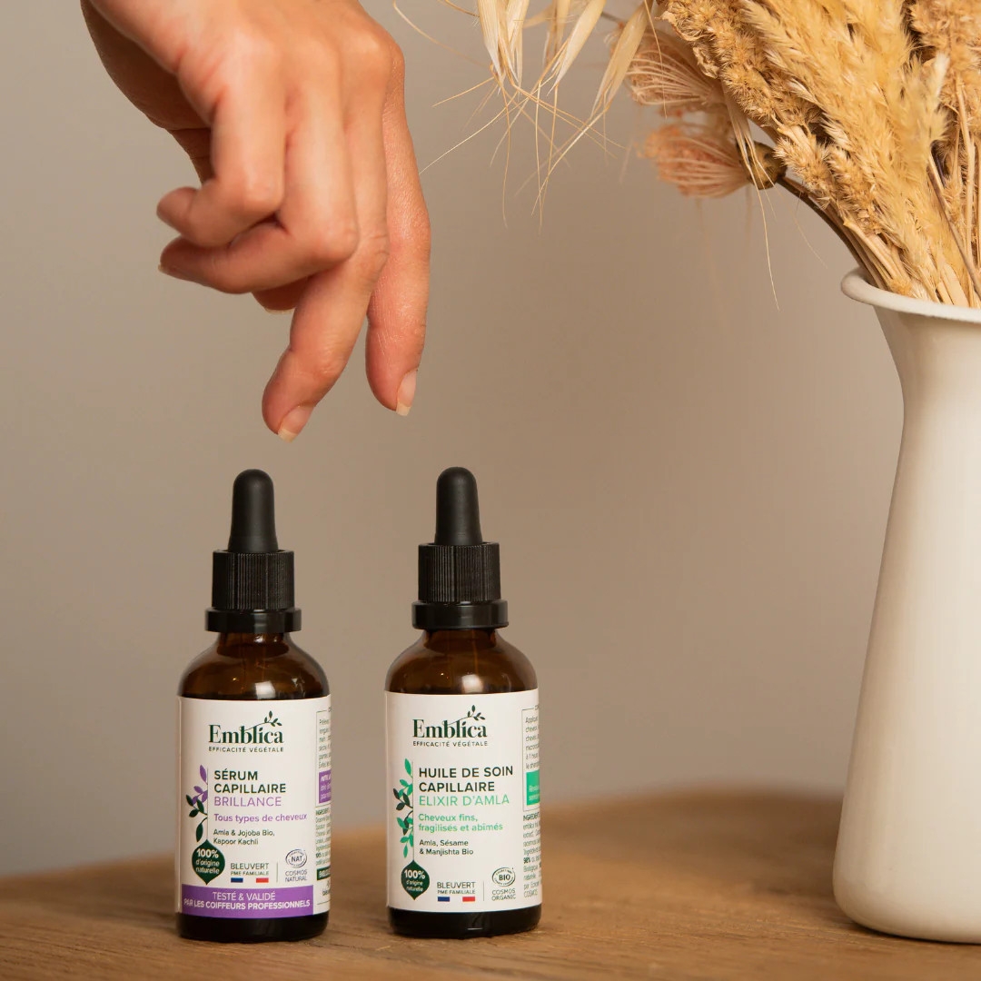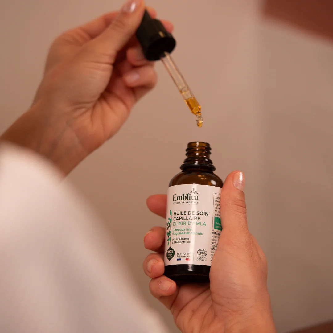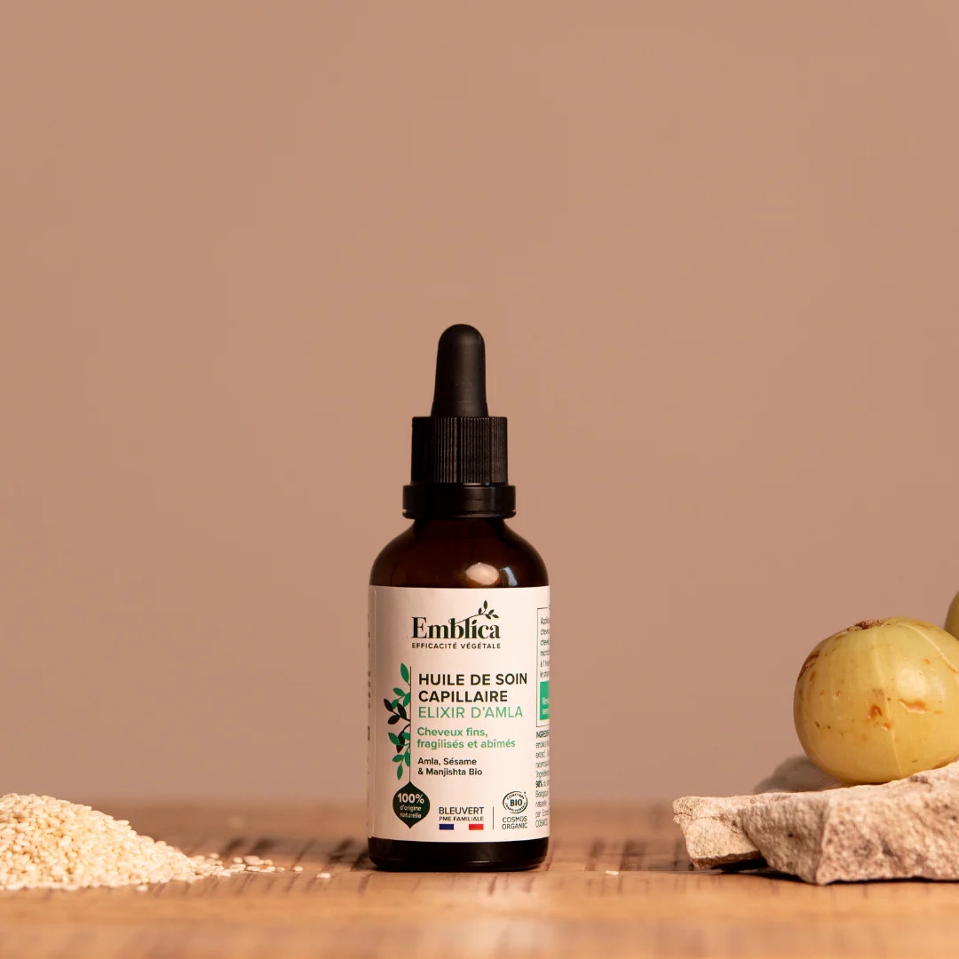 Emblica pečující vlasový olej elixír z Amly je obohacen o bio amlu – indický angrešt, výtažek z kořene ajurvédské rostliny manjisty - mořeny srdčité, výtažek z kurkumy, výtažek z kůry ajurvédského stromu Lodhra.