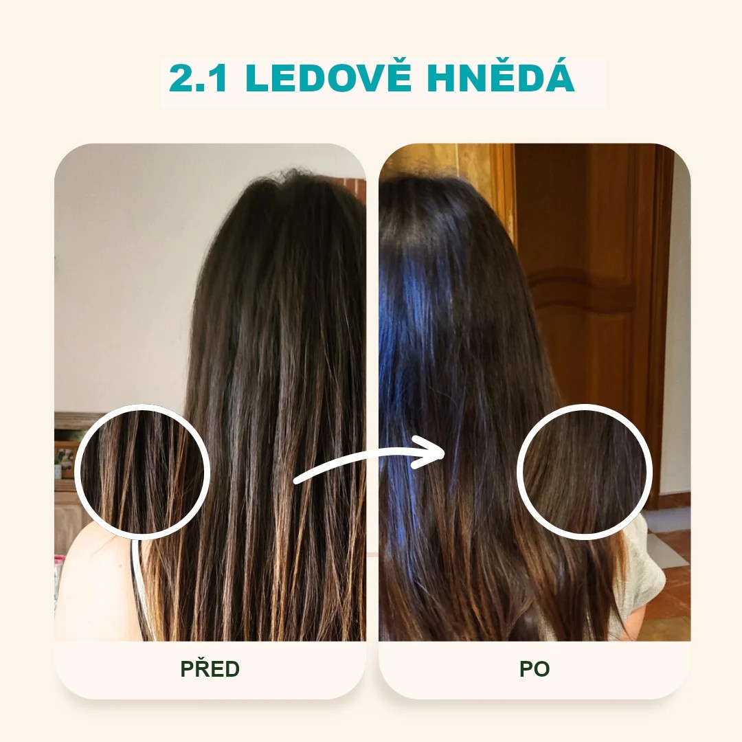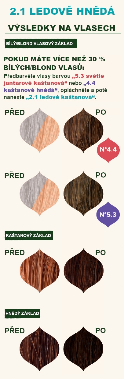 Pokud máte více než 30 % bílých/blond vlasů, předbarvěte je barvou „5.3 světle jantarově kaštanová nebo „4.4 kaštanově hnědá“, opláchněte a poté naneste odstín „2.1 ledově hnědá“.