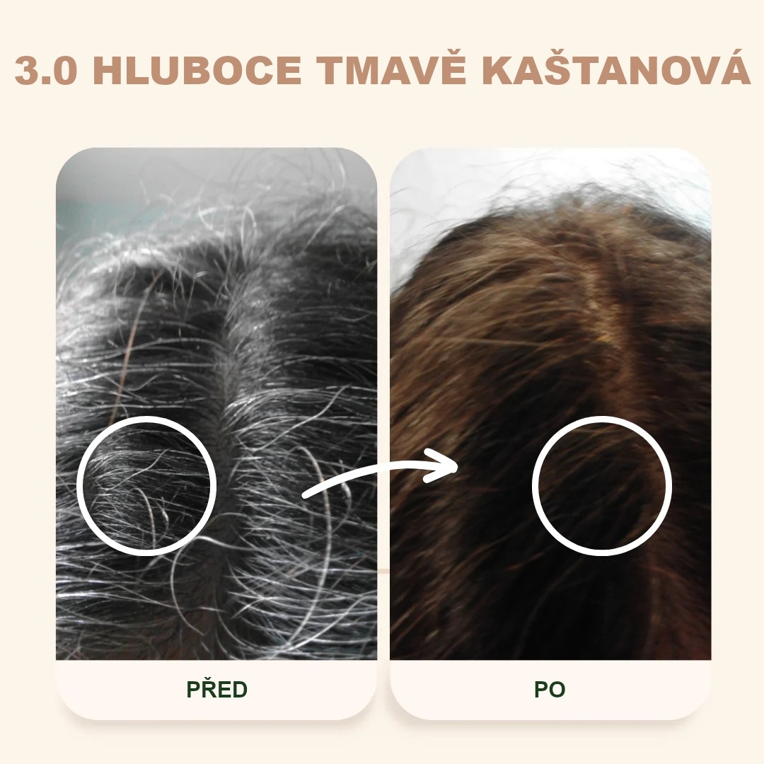 Pokud máte více než 30 % bílých/blond vlasů, předbarvěte je barvou „5.3 světle jantarově kaštanová nebo „4.4 kaštanově hnědá“, opláchněte a poté naneste odstín „3.0 hluboce tmavě kaštanová“.