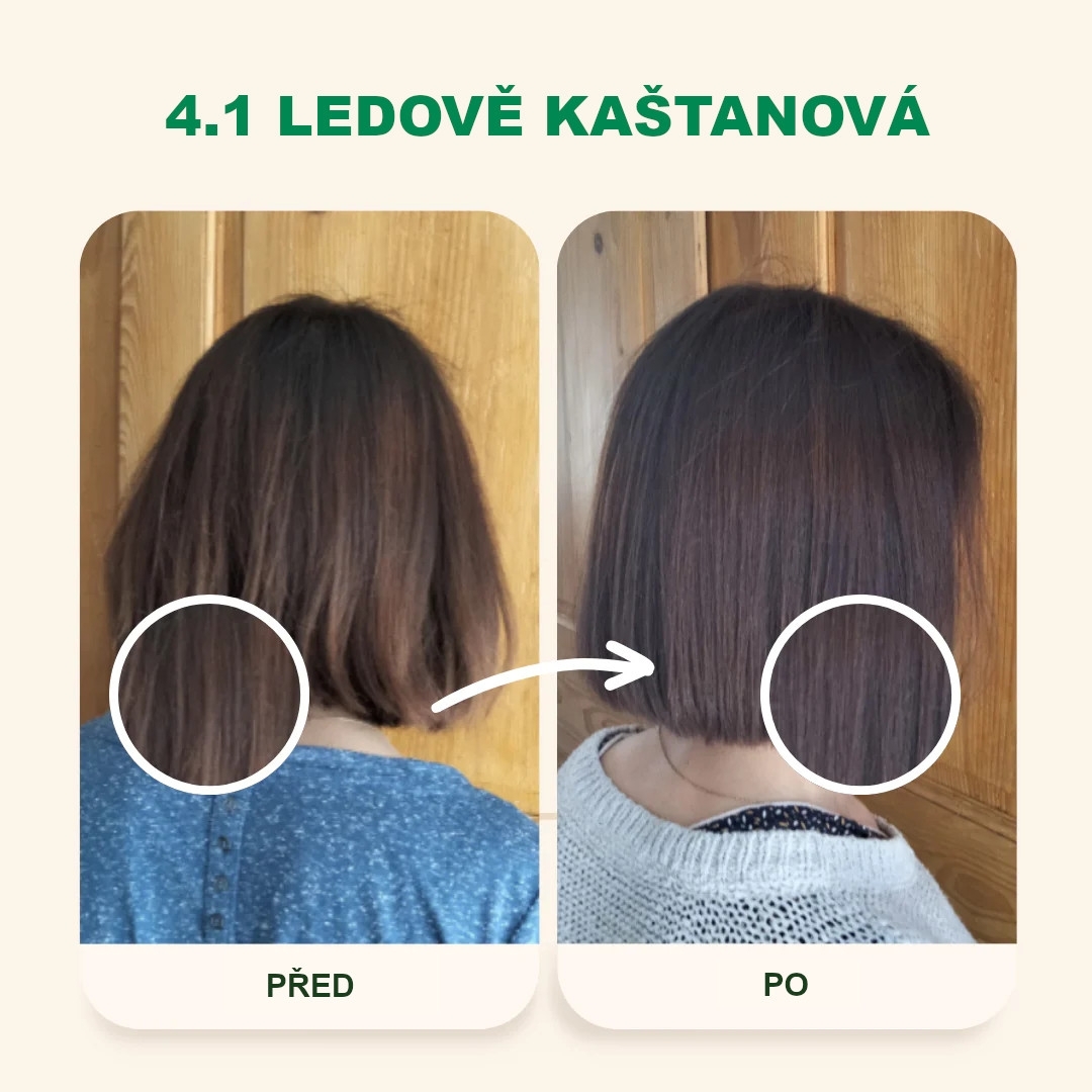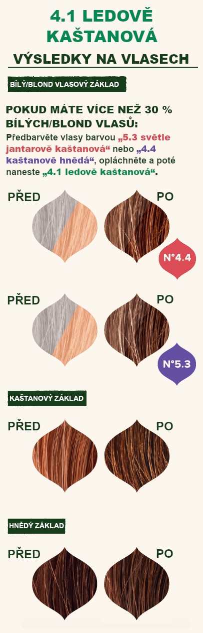 Pokud máte více než 30 % bílých/blond vlasů, předbarvěte je barvou „5.3 světle jantarově kaštanová“ nebo „4.4 kaštanově hnědá“, opláchněte a poté naneste odstín „4.1 ledově kaštanová“.