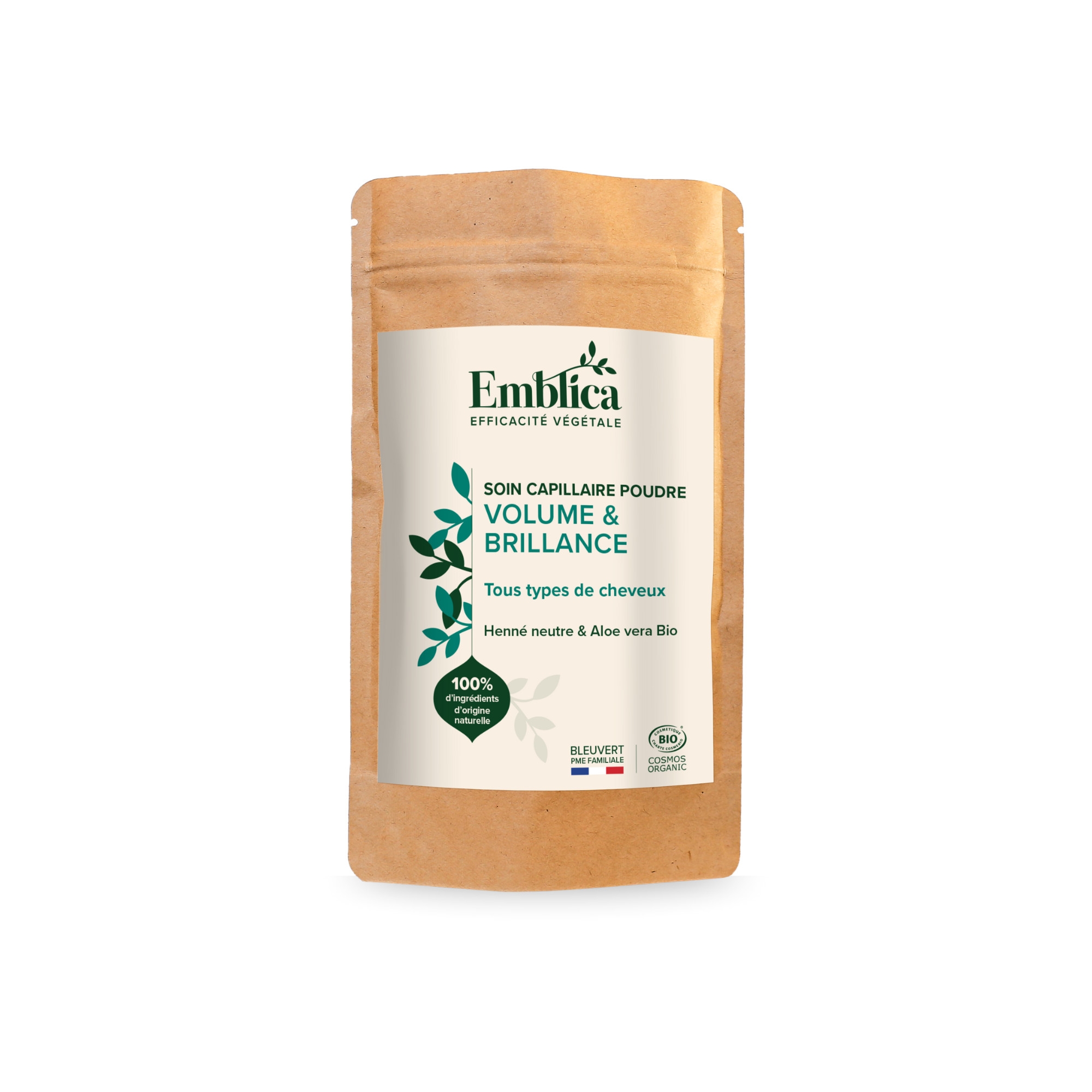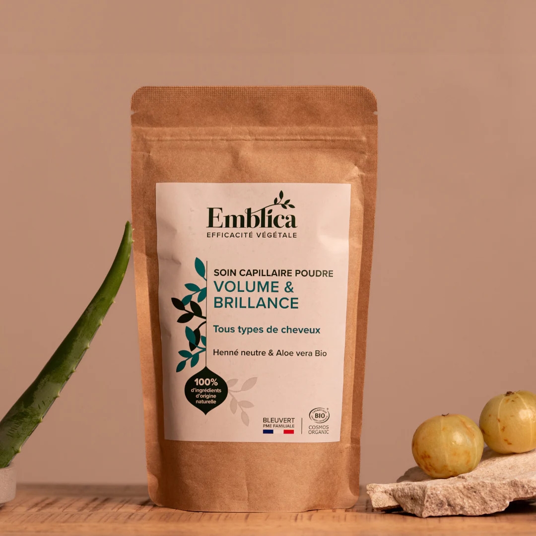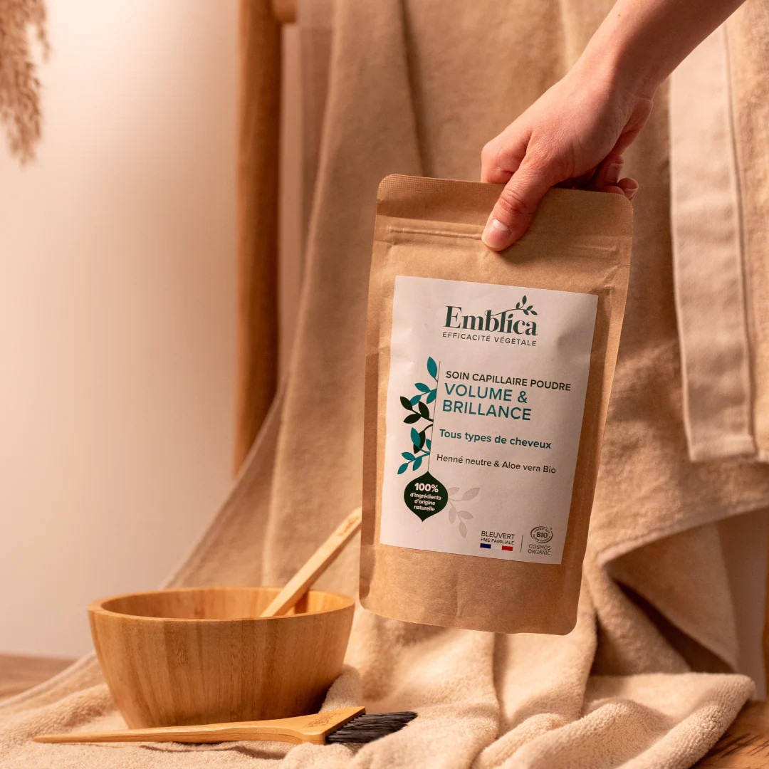 Emblica pudrová péče pro objem a lesk vlasů je obohacena o prášek z bio listů cassia auriculata a bio aloe vera.