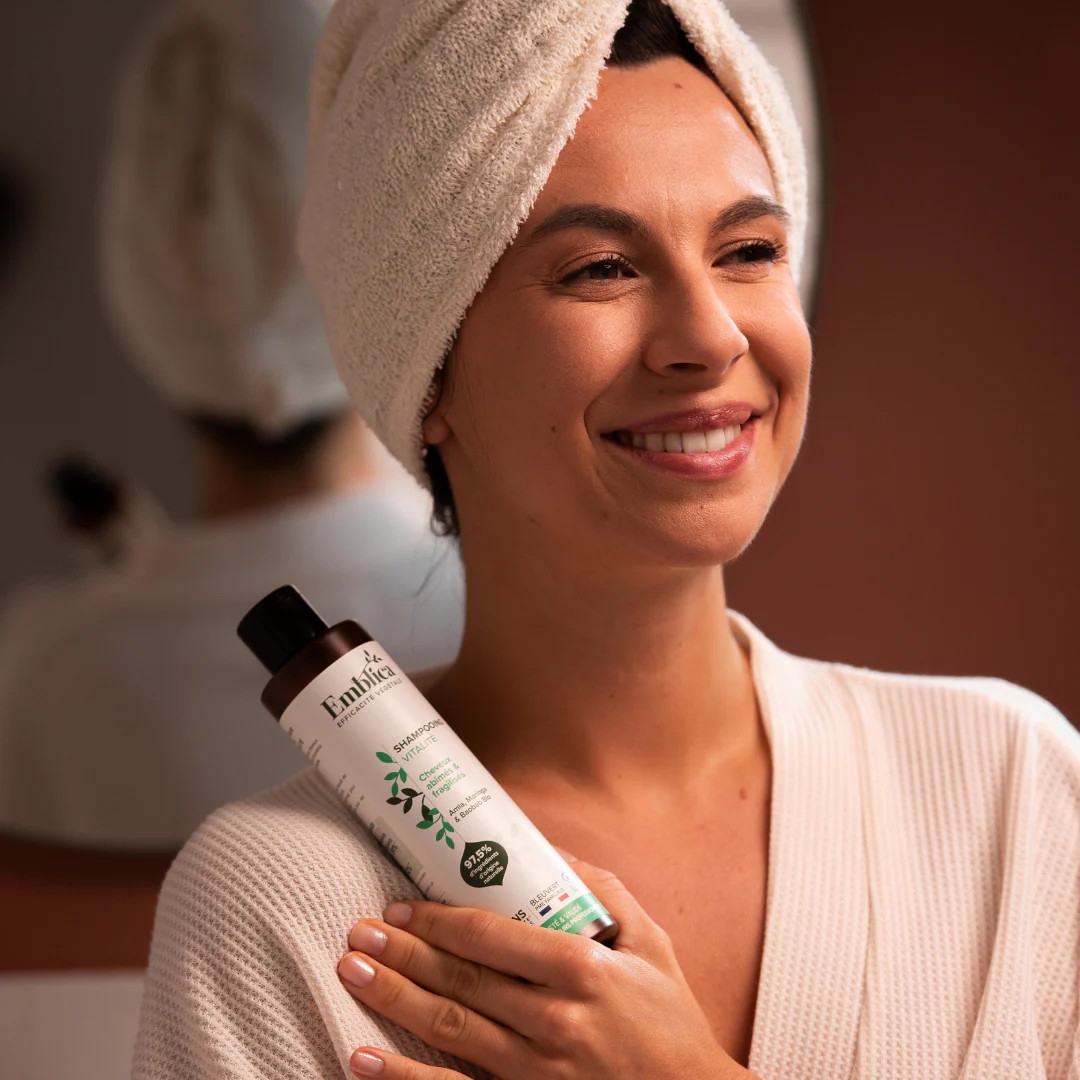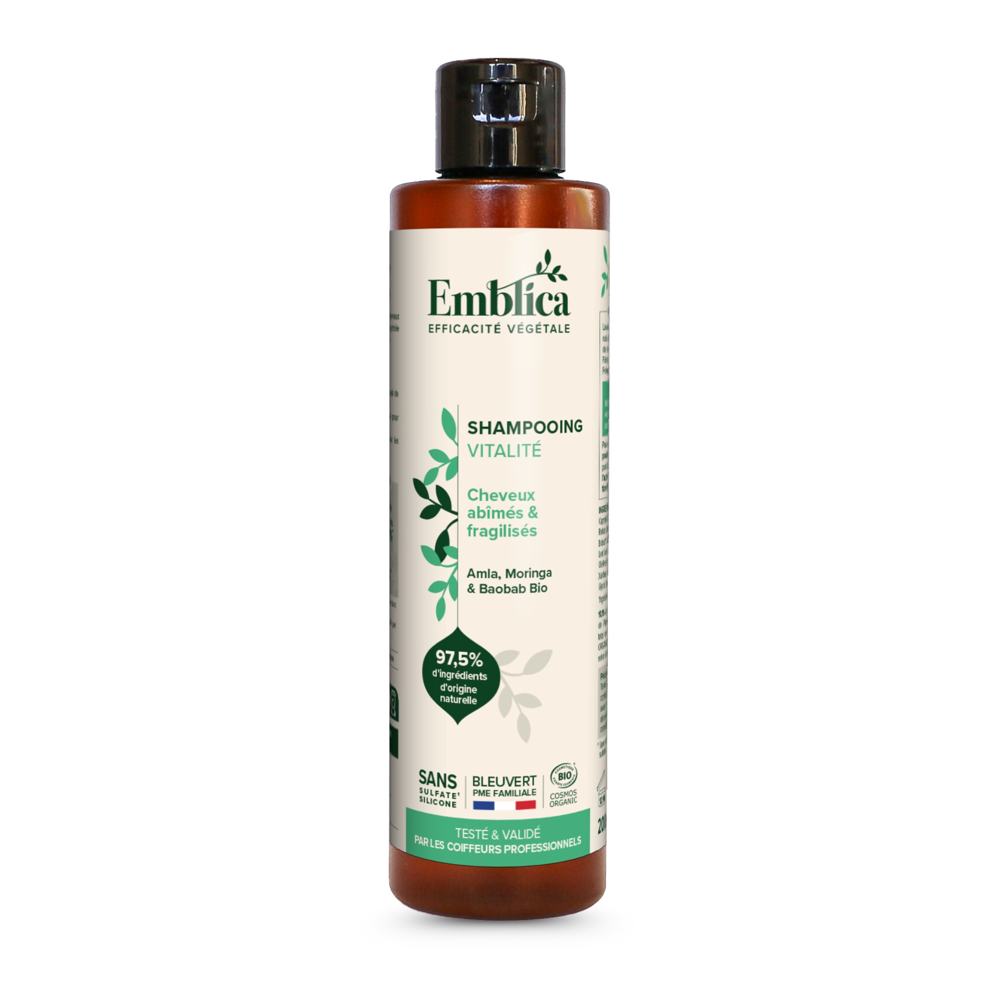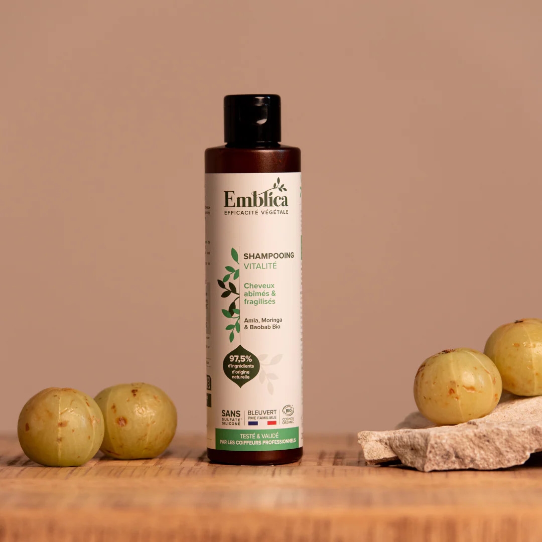 Emblica šampon revitalizační je obohacen o bio amlu – indický angrešt, olej z bio moringy olejodárné, olej z bio baobabu afrického a bio aloe vera.