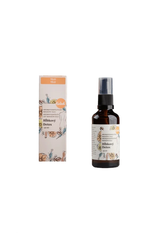 Masážní olej dále obsahuje směs organických esenciálních olejů: skořice, citron, grep, pomeranč, rozmarýn, káva, jalovec.