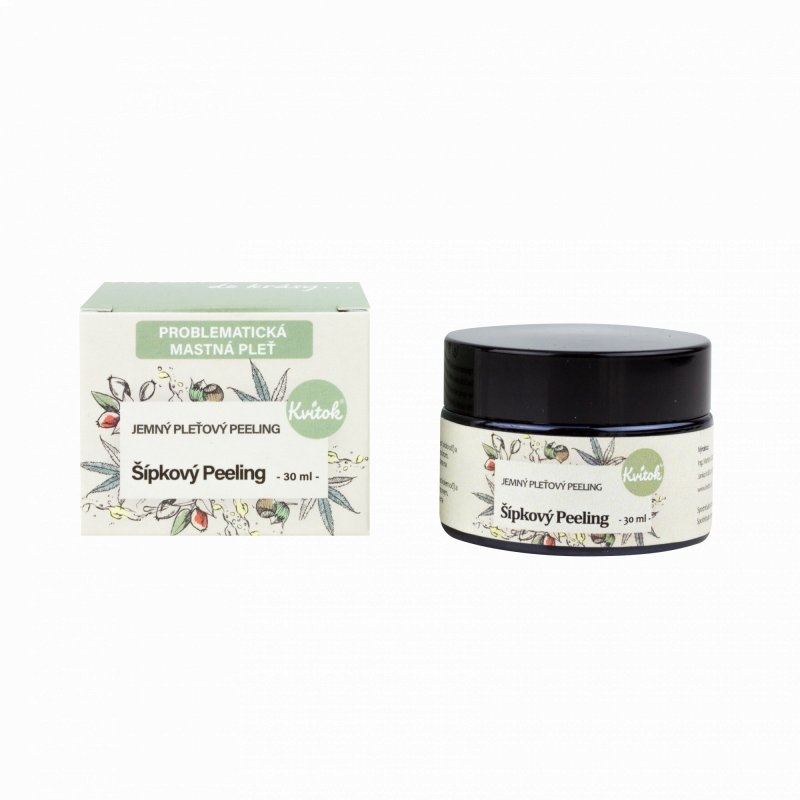 Jemný šípkový peelingový prášek (organický) : Získává se ze semínek šípkové růže a díky svým jemným částicím je ideální pro pokožku obličeje. Jemně, ale do hloubky ji pročistí a podporuje mikrocirkulaci pleti.