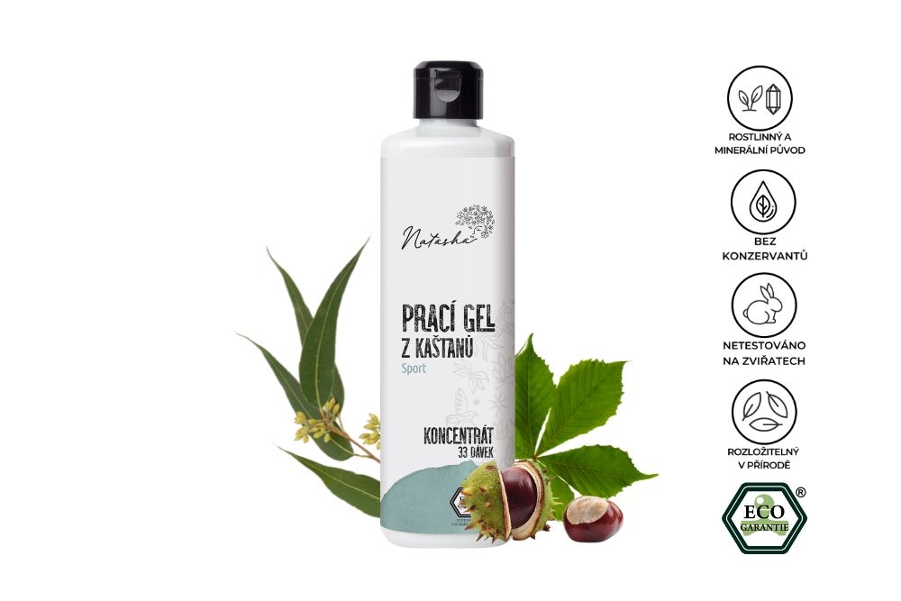 Natasha Prací gel z kaštanů Sport koncentrát: byl speciálně vyvinut tak, aby chránil citlivé technické tkaniny a membrány, aniž by narušil jejich vlastnosti.