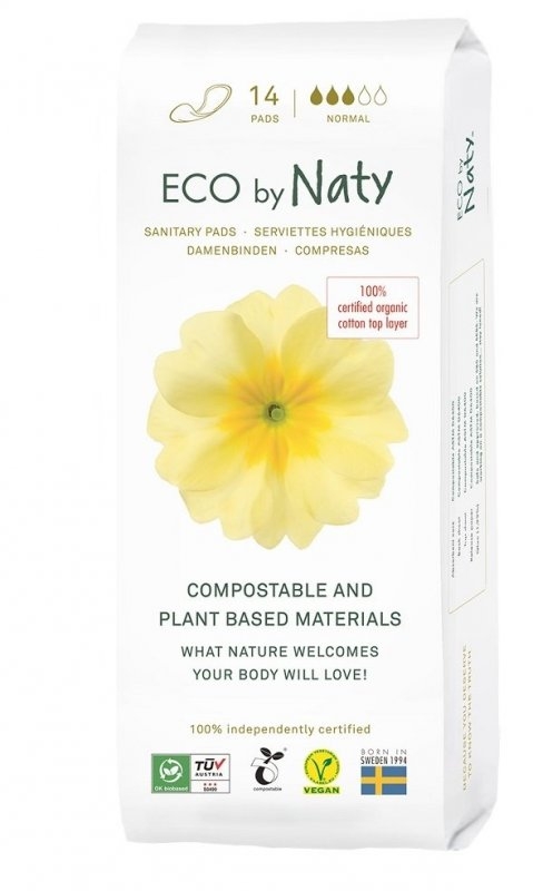 Nové, vylepšené menstruační vložky Eco by Naty jsou vyrobeny z kompostovatelných rostlinných materiálů, vnitřní vrstva vložky je z certifikované organické bavlny a jsou nově individuálně baleny. Celkový obal i obaly jednotlivých vložek jsou z