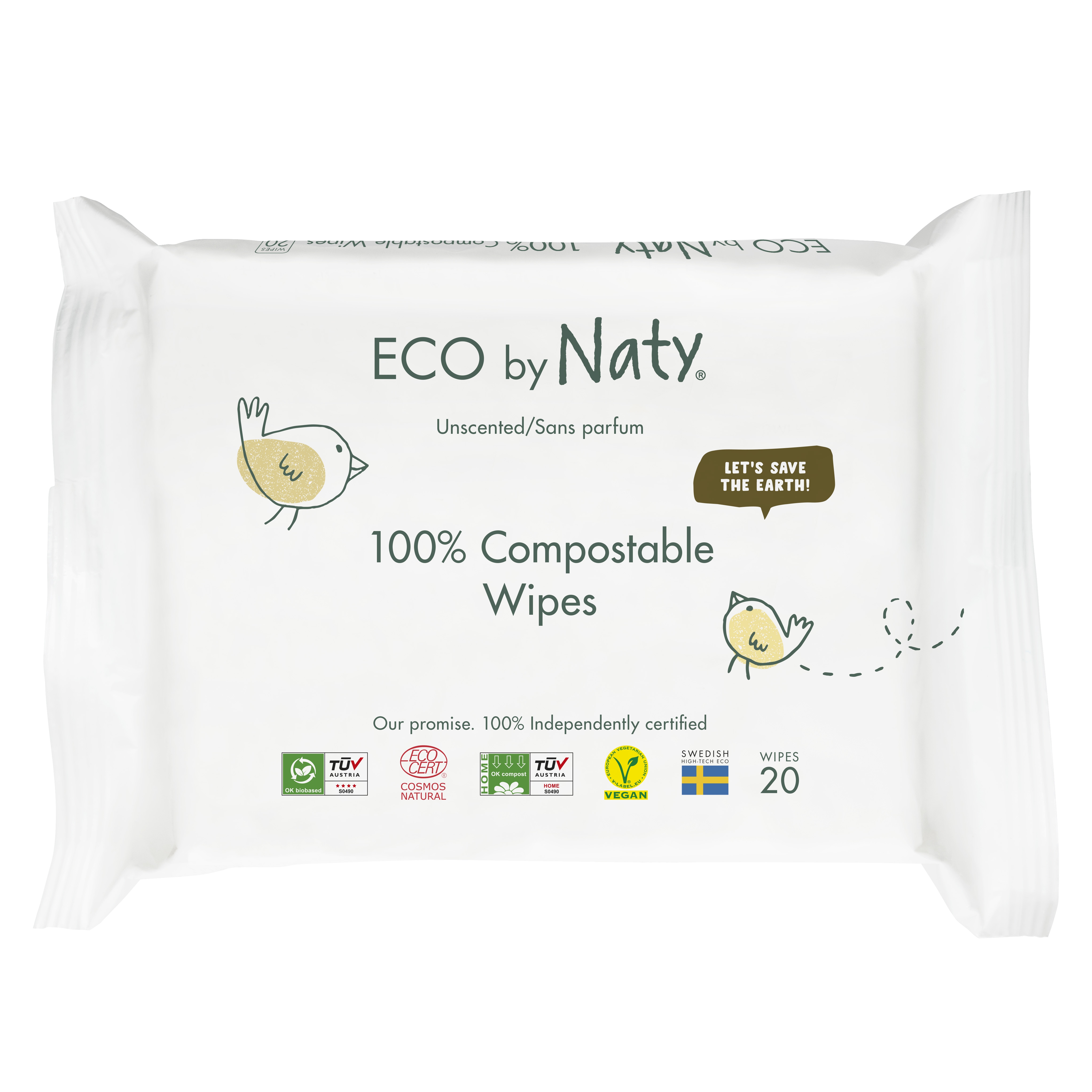 98,4 % vody a za pouhých 12 týdnů se kompletně rozloží. Balení třech ubrousků je vyrobeno z obnovitelných materiálů, konkrétně z cukrové třtiny.