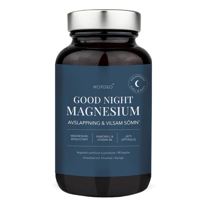 Magnesium Good Night je účinný přírodní doplněk pro podporu při nespavosti. Obsahuje organickou formu hořčíku - bisglycinát hořečnatý, kde je hořčík navázaný na aminokyselinu glycin, jejíž účinky stejně jako u hořčíku souvisí s kvalitou spánku a nervovou soustavou. Účinek doplňku zesiluje extrakt z květu heřmánku, který má vlastnosti související s úzkostnými stavy, neklidem a nespavostí. Tyto složky doplňuje vitamín B6.