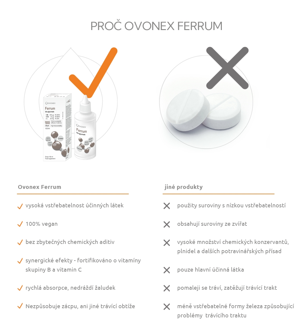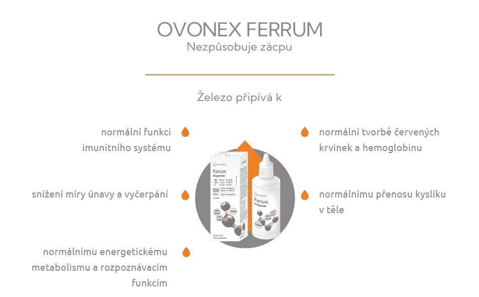 Ovonex Ferrum nezpůsobuje zácpu. Vhodný doplněk stravy zejména pro vytrvalostní sportovce, dárce krve, ženy v aktivním věku, dospívající mládež a všechny, kteří potřebují efektivně doplnit železo.