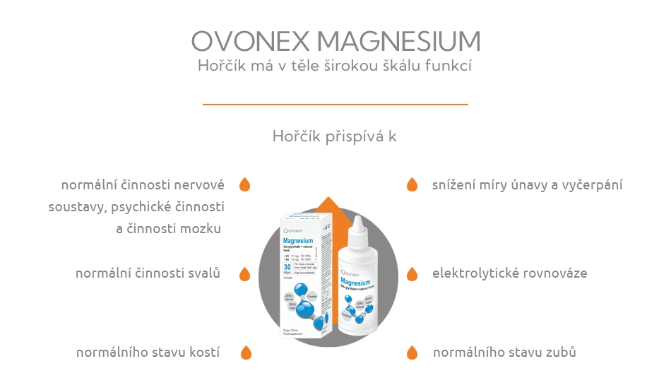Hořčík přispívá ke snížení míry únavy a vyčerpání, k normální činnosti svalů, k udržení normálního stavu kostí a zubů, k normální činnosti nervové soustavy, psychické činnosti a činnosti mozku (zahrnující schopnost koncentrace, učení, paměti a myšlení), k normálnímu energetickému metabolismu a energetické rovnováze těla, k elektrolytické rovnováze (udržení správné hladiny důležitých iontů - sodných, draselných, hořečnatých a dalších) a k normální syntéze bílkovin.