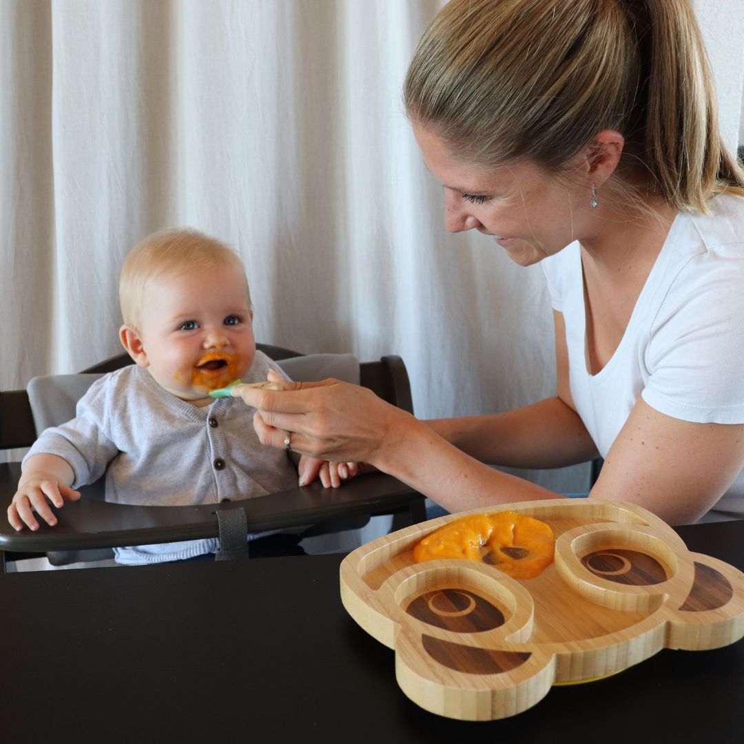 obsahuje velký vícekomorový talíř, misku a dvě bambusové lžičky s měkkou silikonovou hlavičkou.