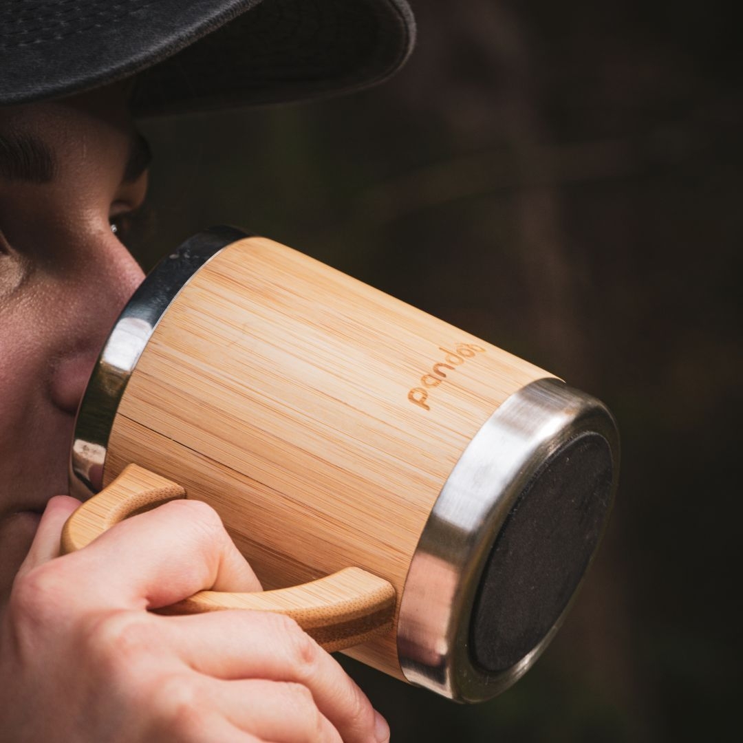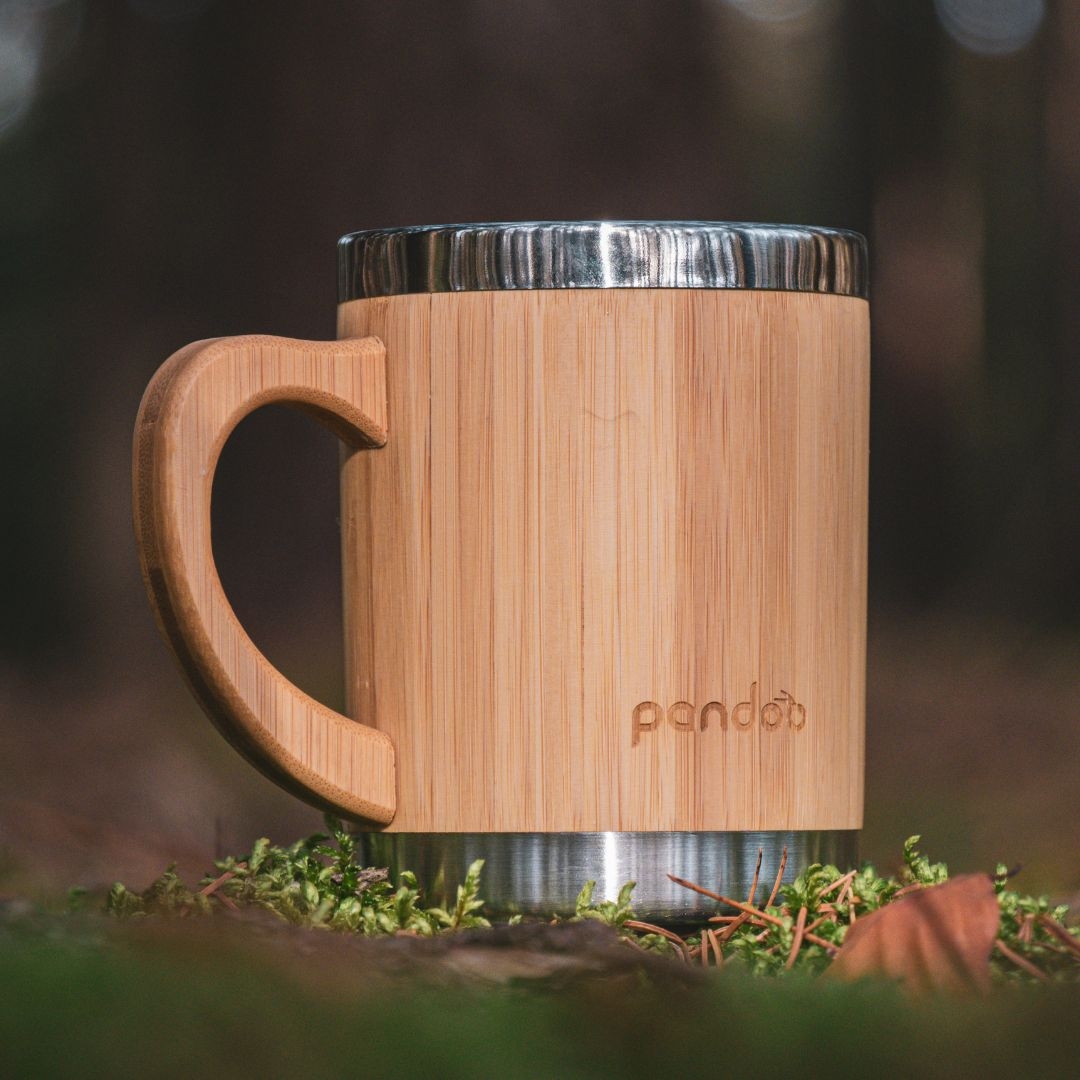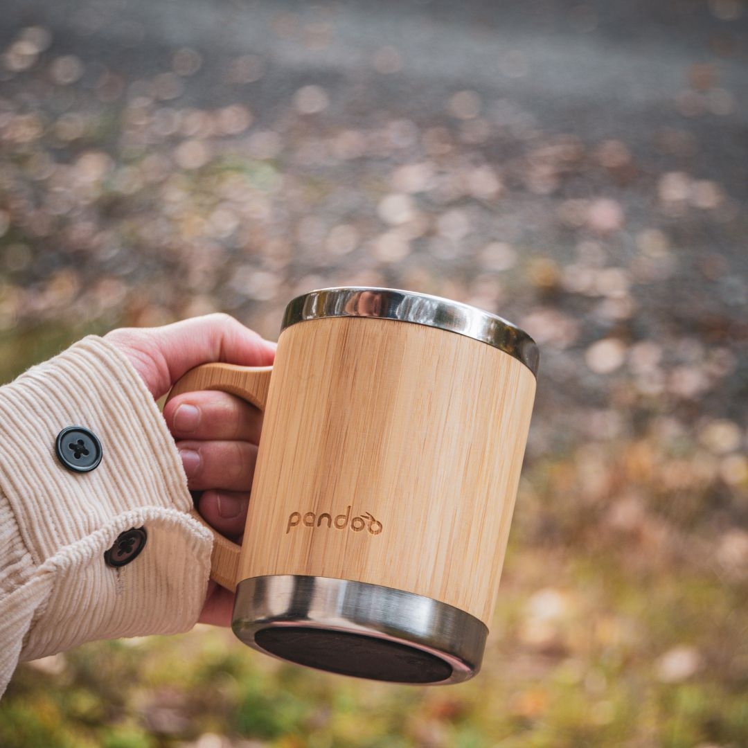 kvalitní designový dvoustěnný nerezový hrnek na kávu a čaj s bambusovým povrchem. Je ideální pro každodenní život bez plastů. Díky