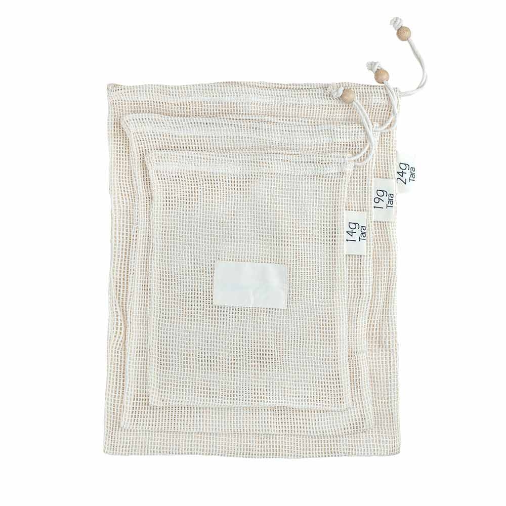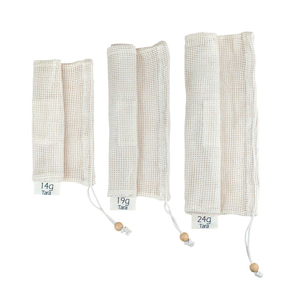 - vysoce kvalitní síťový sáček z bio bavlny s certifikací GOTS a s bambusovou perlou pro zatažení sáčku