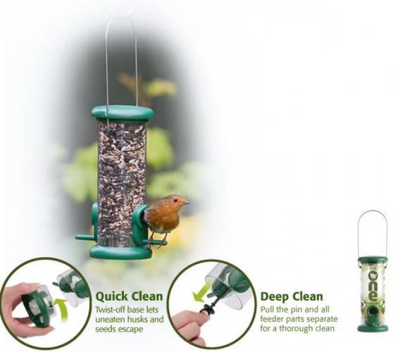 Krmítko se dá snadno úplně rozložit, což je výborné při čistění a případné desinfekci krmítka. (Každé krmítko by se mělo pravidelně čistit, zamezuje se tak přenosu nemocí mezi ptáky).