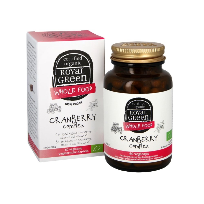 Royal Green Brusinkový komplex poskytuje 100% certifikované organické brusinky, ibišek a vitamin C (z aceroly).