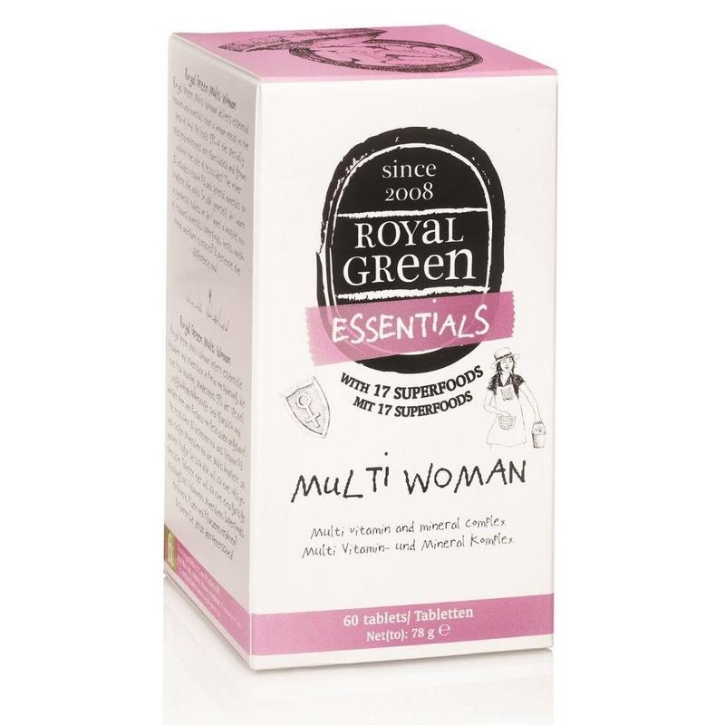 Royal Green Multivitamin pro ženy přináší esenciální vitaminy a minerální látky, které potřebují ženy přijímat v podobě jídla. Náš vitamin C pochází z třešní rostliny malpígie/acerola, komplex vitaminů B z unikátní směsi guavy, bazalky svaté, citronové kůry a selenu z hořčičných semínek. Kromě toho přípravek obsahuje 17 různých superpotravin jako je zázvor, kurkuma, zelený čaj, černý rybíz, borůvky, spirulina, granátové jablko, rozchodnice (rhodiola), lesklokorka lesklá (reishi), housenice čínská (cordyceps), trstnatec lupenitý (maitake) a mnoho dalších! Samozřejmě všechny přísady jsou pěstovány bez použití pesticidů.
