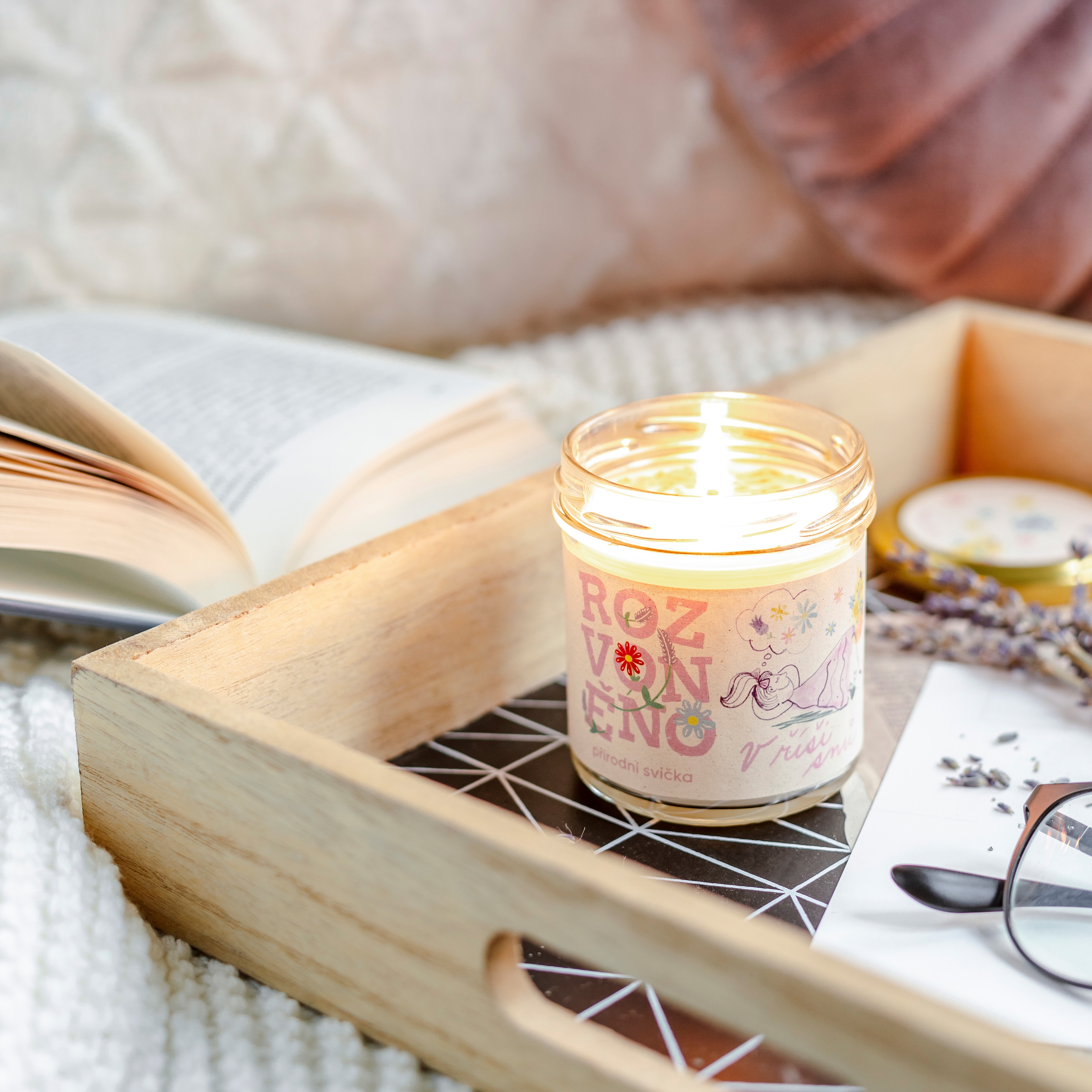 je vyrobena z kombinace přírodních vosků - kokosového a sójového - a je ovoněná 100% přírodním éterickým olejem - levandulí. Svíčka je ozdobena květy levandule.