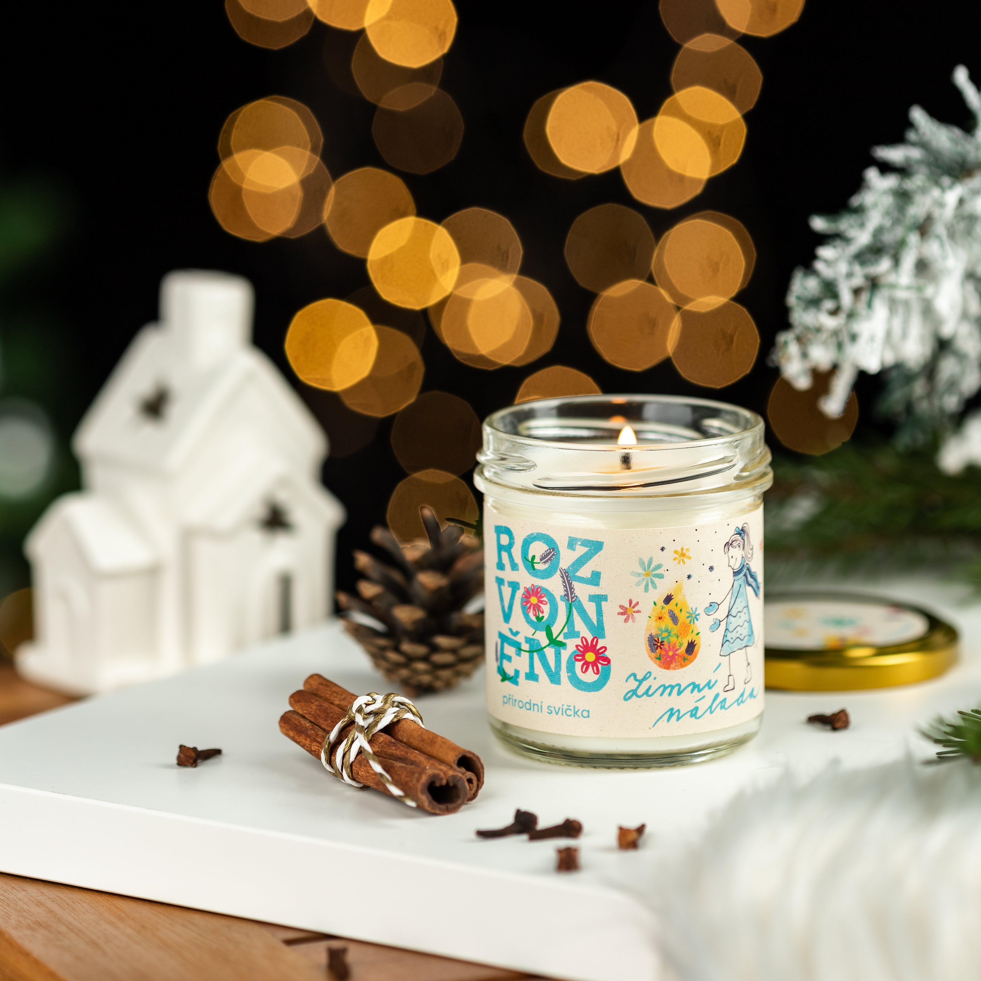 Svíčka Zimní nálada je vyrobena z kombinace přírodních vosků - kokosového a sójového - a je ovoněná 100% přírodními éterickými oleji - pomerančem, hřebíčkem a skořicí.
