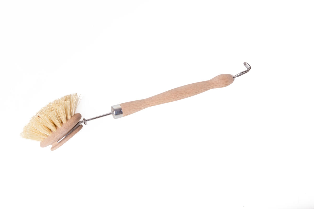 Kartáč na nádobí vyrobený z PEFC certifikovaného dřeva, kovu a štětin z agáve s vyměnitelnou hlavicí. Pro pohodlné mytí nádobí, poradí si i s připálenými hrnci a pánvemi.