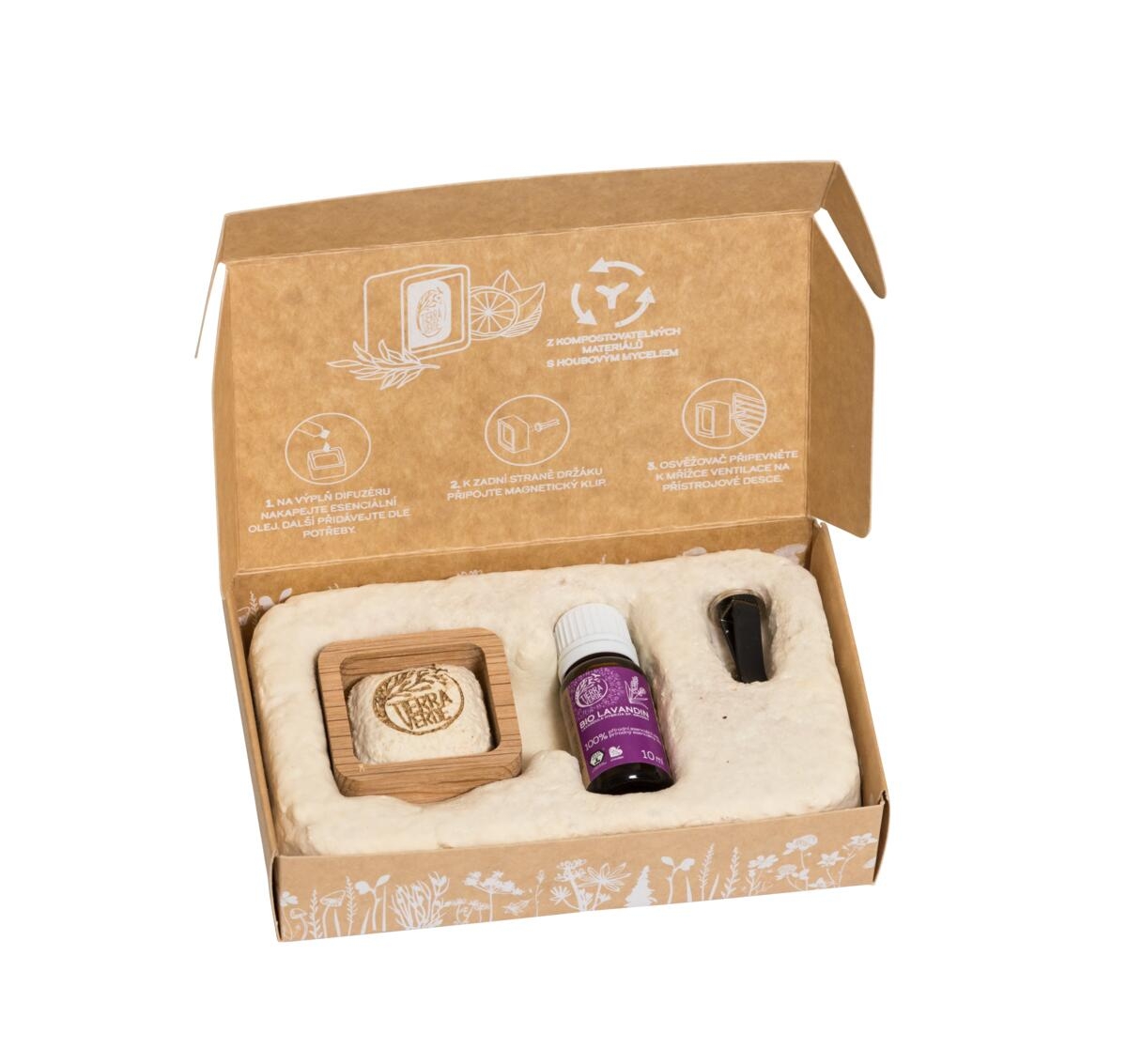 Abyste osvěžovač mohli hned použít, najdete v sadě i lahvičku BIO lavandinového esenciálního oleje. Jeho sladce květinová vůně se svěžími až kafrovými tóny harmonizuje a