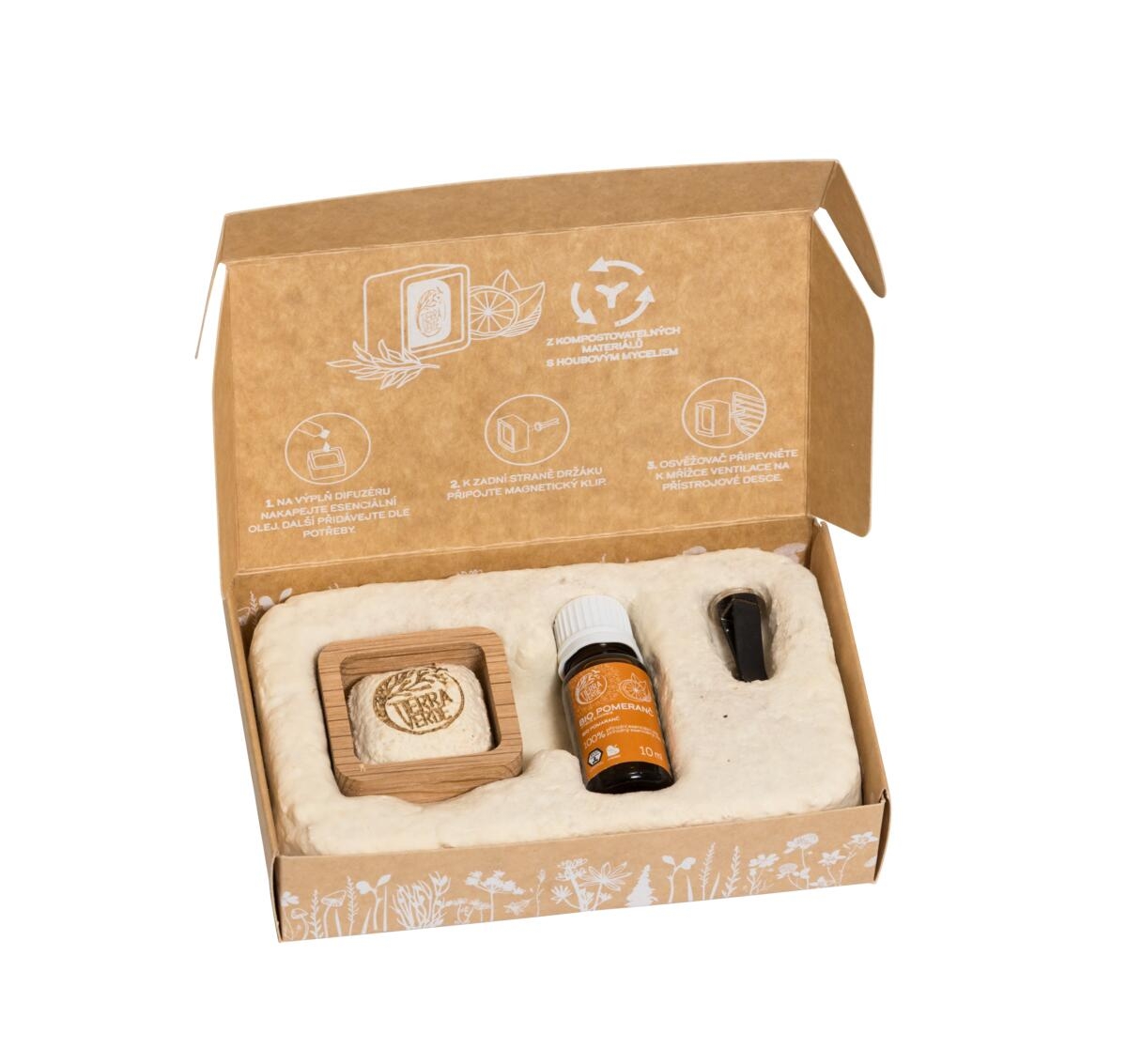 Abyste osvěžovač mohli hned použít, najdete v sadě i lahvičku BIO pomerančového esenciálního oleje. Jeho výrazně sladká a osvěžující vůně vám zvedne náladu a dodá energii. Tento olej se lisuje z plodů, jejichž kůra nebyla chemicky ošetřená, a je vhodný také pro kosmetické použití.