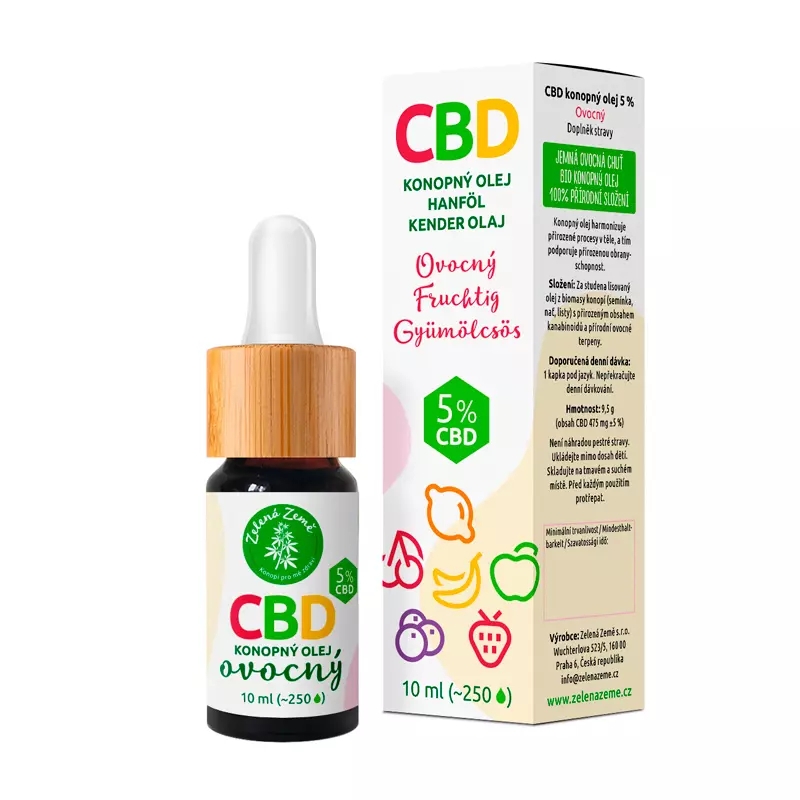 Konopné kapky CBD 5% s ovocnou příchutí jsou doplněk stravy. Obsahují ze zastudena lisovaný konopný olej z biomasy konopí s přirozeným obsahem CBD a dalších kanabinoidů.