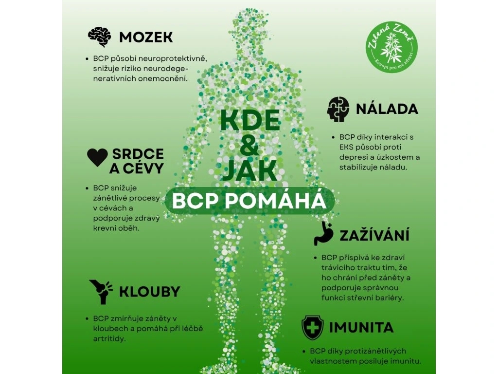 - Obsahují 10 % BCP (Beta - karofylenu) – přírodní aktivní látku působící na CB2 receptory